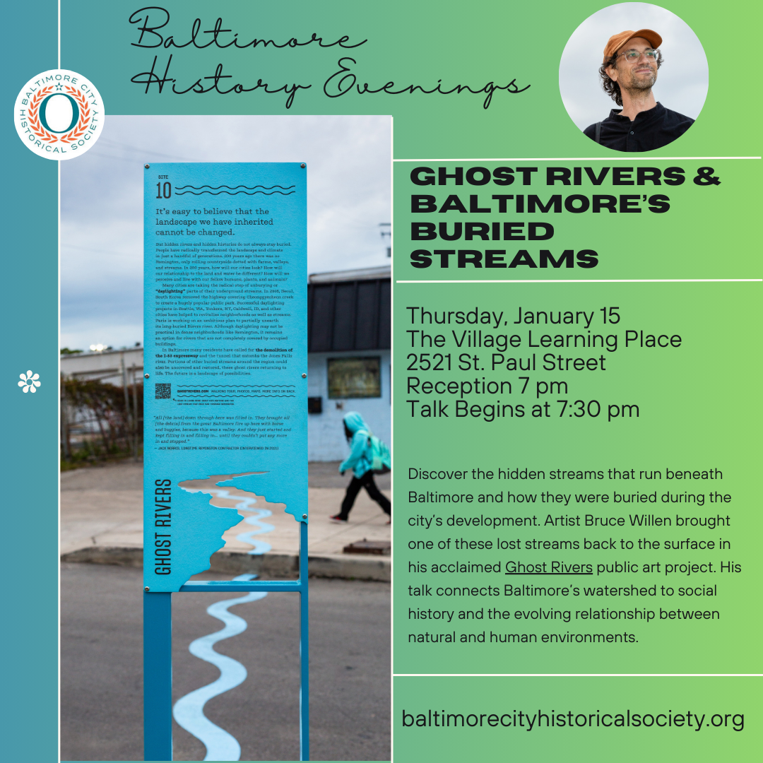 Join Ghost Rivers artist Bruce Willen to discover the hidden streams that run beneath Baltimore and how they were buried during the city’s development. This Baltimore History Evenings talk connects Baltimore’s watershed to social history and the evolving relationship between natural and human landscapes.